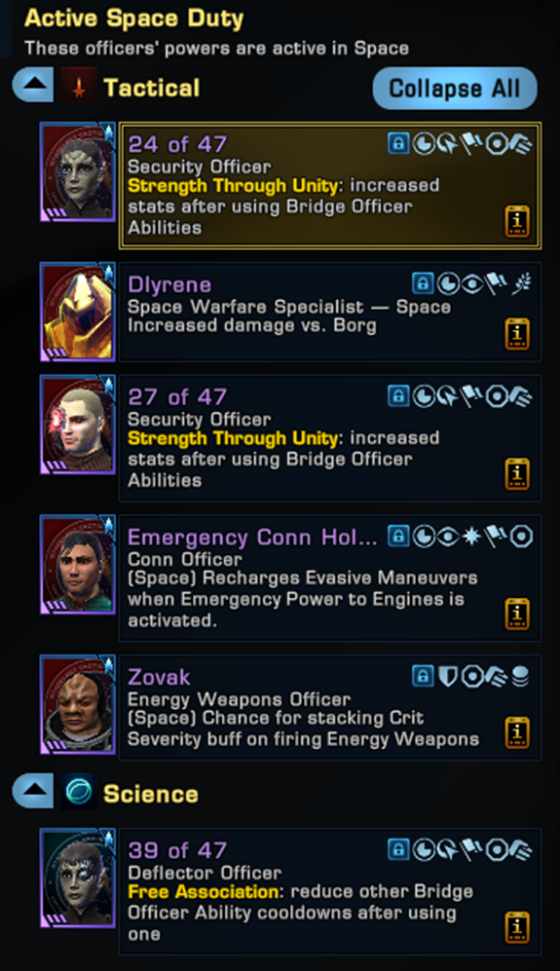 27 of 47 is the most expensive duty officer in the game, granting both critical chance and critical severity on the activation of Tactical and Intelligence bridge officer abilities. This duty officer is currently costing 470m EC and again, is NOT necessary. Meta Builders are using this duty officer, but the rare crit doffs mentioned previously are fine alternatives for a % of the cost.