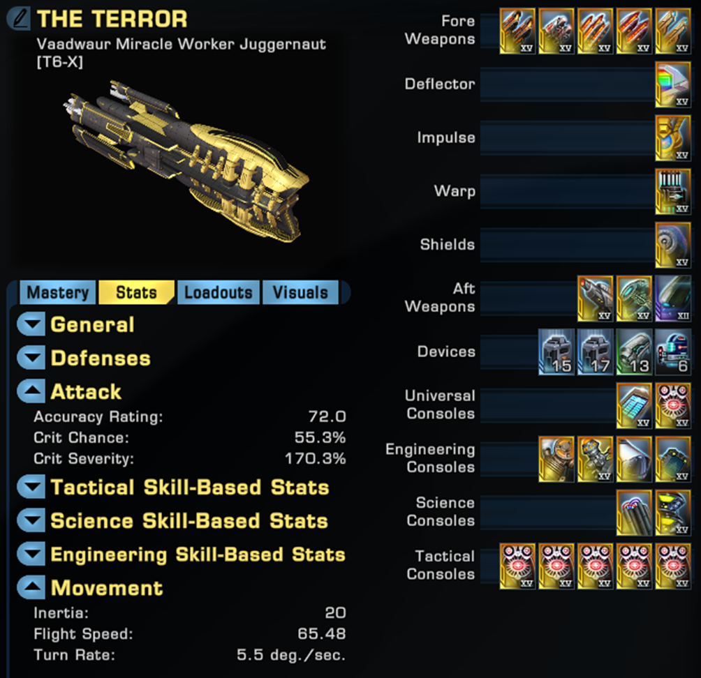 However, let me caveat this with my own experience and a word of warning. Yes, this vessel is the undisputed pinnacle of DEW. However, its potential is locked behind the mastery of piloting in Star Trek Online. The vessel is like a locked door, and behind that locked door is unrivalled damage output by an Energy Build; but the key to unlock that door is the ability to pilot a vessel with an Inertia Rating of 20 and a Turn Rate of 6. Do not underestimate how much of a constant challenge that is.