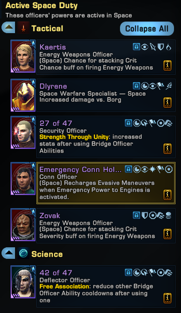 The Emergency Conn Hologram is obtained from the Pheonix Store with a token. This duty officer allows for a resetting of Evasive Manoeuvres by clicking EPtE. This is important to travelling around the map quickly.