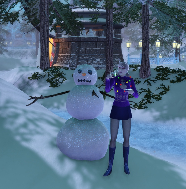 Just submitting for fun (no prizes), but even the Aenar enjoy the Andorian Summer games! 😉 This year, Jhorah is sporting the Snowman Winter Event sweater and a matching pair of Seven’s boots with a 23rd century skirt in navy blue.